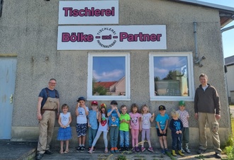 Am 23.05.2024 haben wir die Tischlerei Bölke in Reuden besucht, um zu erfahren, was ein Tischler macht. Angekommen in der Tischlerei zeigten uns Herr Bölke & Herr Hohanns ihre Werkstatt. Die Kinder staunten und waren ganz gespannt, die Maschinen und Werkzeuge genutzt werden. Herr Bölke erzählte uns, was ein Tischler alles herstellt bzw. baut und welche Materialien. Ganz gespannt hörten ihm die Kinder zu. Wir haben viel erfahren über den Beruf des Tischlers. Das war aber noch nicht alles. Die Kinder durften selbst ein Stück Holz schleifen und mit nach Hause nehmen. Ein weiteres Ereignis, welches für strahlende Kinderaugen sorgte, war, dass Herr Bölke die große Maschine vorgeführt hat und die Kinder Ohrschützer aufsetzen durften. Einige Kinder haben großes Interesse für die Arbeit des Tischlers gezeigt und könnten sich vorstellen diesen Beruf später zu erlernen. Wir möchten uns bei Herr Bölke & Herr Hohanns für die aufgebrachte Zeit und das Engagement bedanken.