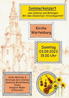 Die Ev. Kirchengemeinde Pratau/Wartenburg lädt herzlich ein zu einem Sommerkonzert am Sonntag, 3. September 2023, um 15:00 Uhr in der Dorfkirche Wartenburg.