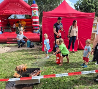 Die FFw Rackith – Lammsdorf unterstützte unser Fest mit Fahrten im Feuerwehrauto und kleinen Löschangriffen auf eine Feuerschale und ein Haus.