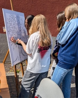 Ein besonderes Highlight war das Mitmachbild zum neuen Schuljahr: Unter Anleitung unserer Kunstlehrerin Carina Engelhardt gestalteten die Schülerinnen und Schüler einen großen „Baum des neuen Schuljahres“. Jedes Kind malte ein Blatt mit seinem Namen und brachte es am Baum an – ein buntes Symbol für unsere Gemeinschaft.