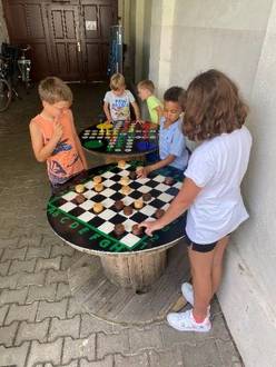 So gestalteten wir uns unsere eigenen Spieltische und konnten diese schon draußen ausprobieren. Mensch ärgere dich nicht oder Schach in XXL Form. Danke an den lieben Papa für die Unterstützung.