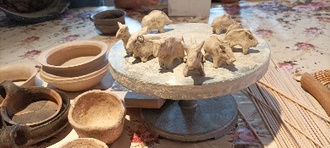 Es wurde mit Naturmaterialien gearbeitet. Hölzer, Steine, Knochen und Geweih wurden zum Modellieren und Glätten oder Stempeln verwendet. Muscheln dienten dazu, einfache Muster zu erstellen. Ausgangsmaterial war auch „wilder Ton“. Es wurden kleine Objekte hergestellt, die den Funden vorgeschichtlicher Keramik nahe kommen. Vergleichsobjekte brachte Herr Schulz mit.