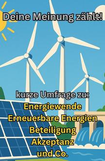 Diese Umfrage soll uns dabei helfen, eine aktuelle Gefühlslage der Bevölkerung zu dem Thema "Erneuerbare Energien" zu ermitteln. Für die zukünftige Ausrichtung der Planungsarbeiten für Erneuerbare Energien sind diese Daten von zentraler Bedeutung.
