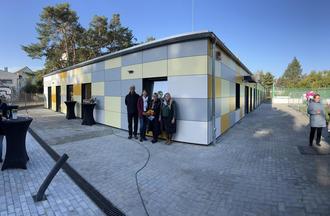 Innerhalb von nur sieben Monaten, seit Erteilung der Baugenehmigung Ende Januar 2024, entstand in Modulbauweise ein Gebäude für 150 Hortkinder. Nach der Grundsteinlegung Mitte März folgten im April die vorgefertigten Module des Komplexes. Die Gebäudeteile wurden im Werk vormontiert, sodass Türen, Fenstern, Dämmung, Elektroanlage, Toiletten und Sanitärräume fertig ankamen. Vor Ort wurden die Module verbunden und der Innenausbau konnte beginnen. Dies verkürzte die Zeit bis zur Fertigstellung erheblich, sodass Mitte August alle Räume mit Akustikdecken ausgestattet, Elektrik und Sanitäranlagen angeschlossen und die Malerarbeiten abgeschlossen waren. Zum Ende der Sommerferien fand der Umzug statt, und seit dem 2. September 2024 wird das neue Hortgebäude genutzt. Bis Ende Oktober wurden die Außenanlagen fertiggestellt. Ein Rollrasen, entsprechende Ausgleichspflanzungen und die Erneuerung der Bewässerungsanlage lassen den Schulhof der Grundschule schnell wieder ansehnlich werden.