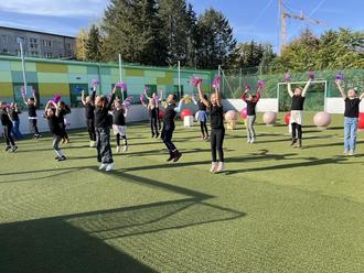 Tanzend erfreuen die Hortkinder die Gäste der feierlichen Eröffnungsfeier vor dem Neubau.