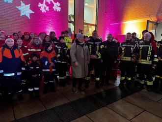 Vor dem weihnachtlich illuminierten Rathaus begrüßte Bürgermeisterin Michaela Wiezorek die Teilnehmer am Ende der Lichterfahrt der Feuerwehr.