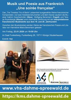 Mit Musik und Wort wird die perfekte Stimmung „Une soirée française“ kreiert. Das „The Timeless Trio of Berlin“ präsentiert am 23. Januar 2026, 19 Uhr ausgewählte Werke aus der Feder französischer Komponisten.