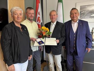 Hans-Jürgen Müller (2.v.r.) erhielt die Bundesverdienstmedaille in festlicher Runde von Michaela Wiezorek, Jörg Liebing (2.v.l.) und Lars Herzberger (r.).