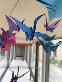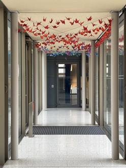 Um die Arbeit der Kinder zu würdigen und den Appell der „Mayors for Peace“ zur weltweiten Abschaffung der Atomwaffen Ausdruck zu verleihen, zieren die farbigen Origami-Kraniche jetzt das Rathaus. Im Verbindungsgang zwischen Haus A und B können sich Besucherinnen und Besucher an der Arbeit der Kinder freuen und sich über das Anliegen informieren.