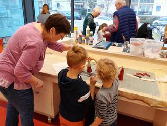 Gemeinsam basteln Seniorinnen und Kinder im Bürgertreff Fontaneplatz.
