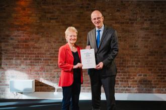 Birgit Uhlworm erhält von Michael Brand, parlamentarischer Staatssekretär bei der Bundesfamilienministerin, die Urkunde für das "Bündnis für Familie Königs Wusterhausen".