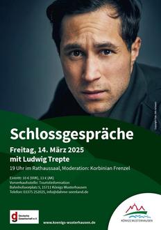 Die Stadt Königs Wusterhausen lädt am Freitag, 14. März 2025, 19.00 Uhr zum nächsten Schlossgespräch. Dieses Mal ist der Schauspieler Ludwig Trepte zu Gast im Rathaussaal. Er wird die Fragen des Moderators Korbinian Frenzel beantworten. Es geht wie immer nicht nur um Persönliches, sondern auch um aktuelle gesellschaftliche Themen.
