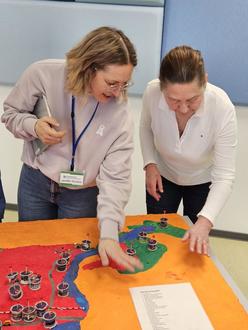 Jeniffer Stuckas erklärt Tina Olschewski-Emden von der Bürgerstiftung Königs Wusterhausen das von den Kindern gebastelte Modell.