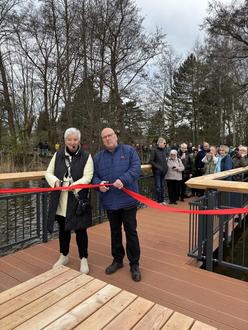 Gemeinsam zerschnitten Bürgermeisterin Michaela Wiezorek und Ortsvorsteher Uwe Friedrich das Band an der Aussichtsplattform.