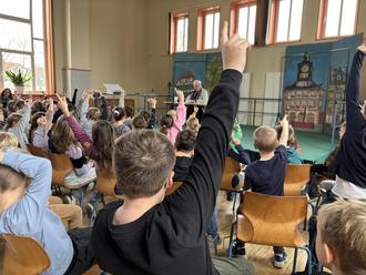 In der Aula der Grundschule „Erich Kästner“ liest Bürgermeisterin Michaela Wiezorek beim Vorlesetag vor Drittklässlern.