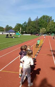 Die vier- bis sechsjährigen Kinder zeigten großen Einsatz und Begeisterung. Teilgenommen haben die Kitas „Waldhaus“, „Spatzennest“, „Arche Noah“, „Steinbergwichtel“, „Tannenzapfen“ und „Knirpsenstadt“ sowie als Gast aus Schönefeld die Kita „Schwalbennest“. Neben den klassischen Disziplinen standen auch Sackhüpfen, ein Hindernisparcours und das Reaktionsspiel „Blazepod“ auf dem Programm – bei Letzterem wurde die Reaktionsgeschwindigkeit auf Lichtsignale getestet. Ein besonderes Highlight war das gemeinsame Schieben eines echten Polizeiwagens, eine Teamaufgabe mit viel Spaßfaktor.