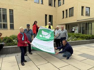 Bürgermeisterin Michaela Wiezorek hisste gemeinsam mit Stadtverordneten unterschiedlicher Fraktionen die Flagge der "Mayors for Peace".