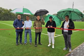 Bei grauem Himmel und stetigem Regen freute sich Bürgermeisterin Michaela Wiezorek über „genau das richtige Wetter“. Denn: „Der große Vorteil eines Kunstrasenplatzes liegt auf der Hand: Ein witterungsunabhängiger Spielbetrieb ist dadurch ganzjährig möglich.“
