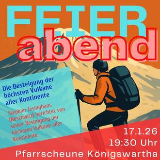 Hoch hinaus geht es beim FEIERabend im Januar. Stephan Jesinghaus (Neschwitz) berichtet von seinen Besteigungen der höchsten Vulkane aller Kontinente. Zu diesem Vortrag laden wir am 17. Januar um 19:30 Uhr ganz herzlich in die Pfarrscheune Königswartha ein! Pfr. Mahling