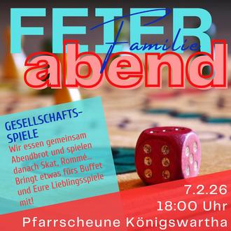 Zum Ferienbeginn laden wir zum FEIERabend mit Gesellschaftsspielen. Wir spielen Rommé, Skat und SKYJO. Bringt etwas für das gemeinsame Abendbrot und Eure Lieblingsspiele mit! Wir sehen uns am Samstag, dem 7. Februar um 18:00 Uhr zum FEIERabend in der Pfarrscheune Königswartha! Pfr. Mahling