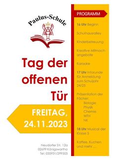 Am 24.11.2023 laden wir zum Tag der offenen Tür alle ein, die an unserem Schulkonzept interessiert sind. An diesem Tag öffnen wir ab 16 Uhr die Pforten und bieten Ihnen ein buntes Programm. Wir zeigen Ihnen unser Schulhaus und geben Auskunft zu den Fächern der Oberschule. 18 Uhr wird unsere Klasse 5 ihr Musical in der Aula vorführen.