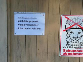 Am Montag den 25.09.2023 musste der Spielplatz für den Besucherverkehr bis auf weiteres gesperrt werden, weil Jugendliche am Wochenende zuvor Glasflaschen mutwillig zerschlagen und die entstandenen Scherben im Fall Sand der Spielgeräte vergraben haben. An den Scherben hätten sich spielende Kleinkinder ernsthaft verletzen können.