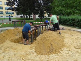 In der Woche zuvor konnten alle Kinder unsere fleißigen Hausmeister beobachten, wie diese, dass neue Spielgerät in einem der Sandkästen aufbauten.