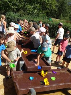 Feierlich weihten wir unsere neue Matschanlage mit einem kleinen Rahmenprogramm ein. Eltern wurden von ihren Kindern spontan zum Verweilen eingeladen. Stellvertretend übernahm Lennard Hanelt die ehrenvolle Aufgabe das Baustellenband der Baustellenumrandung zu zerschneiden.
