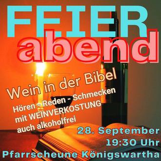 | 28.09. | 19:30 Uhr | FEIERabend - Wein in der Bibel (mit Weinverkostung) |