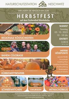 Am Sonntag, den 05.10.2025 von 10 – 18 Uhr lädt die Naturschutzstation Neschwitz zum traditionellen Herbstfest auf den Fischereihof Kleinholscha ein!
