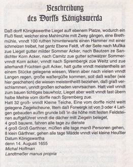 Beim Quellenstudium zur Geschichte der Teichwirtschaft in der Oberlausitz wurde durch den Historiker Dr. Hartstock im Sächsischen Hauptstaatsarchiv, Außenstelle Bautzen, eine bislang unbekannte Quelle zu Königswartha gefunden. Es handelt sich dabei um eine Beschreibung von Königswartha aus dem Jahre 1655. Diese Beschreibung ist jedoch unter den Akten der Standesherrschaft Muskau abgelegt. Die Gründe sind vorerst noch unklar, möglicherweise sollte hier ein Verkauf vorbereitet werden, denn diese Beschreibung gleicht einem Inventar. Es war die Zeit kurz nach dem Dreißigjährigen Krieg. Insofern ist interessant, ob die Folgen noch spürbar waren. Von besonderer Bedeutung dürfte dabei die Erwähnung eines Hammerwerkes mit Schmelzvorrichtung sein. Auch das Teichgebiet mit 32 Teichen muß annähernd die heutige Ausdehnung erreicht haben, wobei durch die Existenz des Eisenhammers vieles auf die Verarbeitung von Raseneisenstein deutet. Auch dies hat sicher die Entstehung von Teichen begünstigt. Erstaunlich ist ebenso das Vorhandensein massiver steinerner (mit Dachziegeln) bedeckter Gebäude eines Vorwerkes kurze Zeit nach dem verheerenden Krieg. Davon gibt auch die geringe Zahl von besitzenden Untertanen (4 Großbauern, 4 Großgärtner und 8 Kleingärtner) Zeugnis, wobei die unvermögenden Häusler ungezählt bleiben. Auch ihre der Herrschaft schuldigen Dienste werden kurz beschrieben. Für Landwirte mag aufschlussreich sein, wie die in jeweiliger Richtung liegenden Flächen beurteilt wurden.