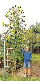 Die Sonnenblume von Annelies Kunze hat eine Höhe von 4,05 Meter, einen Stammumfang von 14 cm (gemessen am 15.9.25) und belegt damit „Platz 2“!