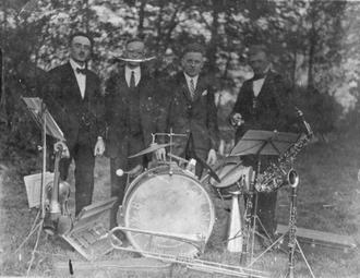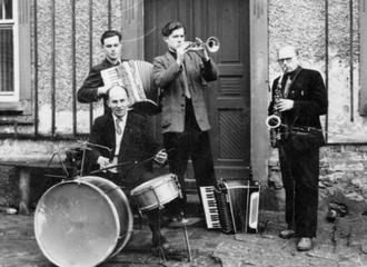 Die Kapelle. Ernst Elle mit großer Jazztrommel, gekauft in Markneukirchen.