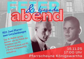 Am Samstag, dem 15. November, ist Sup. iR. J. Malink zu Gast in Königswartha. Er spricht über die beiden Pfarrer Georg Mahling aus Lohsa und Julius Riotte aus Königswartha. Die beiden waren nicht nur benachbarte Kollegen, sondern auch freundschaftlich und familiär miteinander verbunden. Wie die Politik das Verhältnis Pfarrer nach 1933 veränderte, wird Thema des Vortrags sein. Dazu laden wir Sie um 17:00 Uhr in die Pfarrscheune Königswartha ein. Der Vortrag ist in deutscher Sprache. Pfr. Mahling