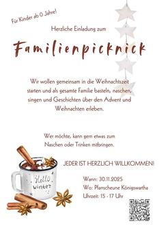 | 30.11. | 15:00 Uhr | Familienpicknick für Familien mit Kindern ab 0 Jahren in der Pfarrscheune |