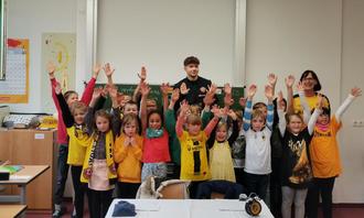 Aus einer spontanen Idee wurde ein spannender Vorlesetag an unserer Grundschule. Diese liegt nicht nur im Grünen sondern auch im Dynamoland. Und so drehte die Klasse 2a ein Bewerbungsvideo und schickte dieses mit gereimten Grüßen nach Dresden. Vollkommen überraschend erhielten wir die Nachricht, dass unsere Kreativität belohnt wird und ein schwarz-gelber Vorleser am 17.11.2023 in der Klasse 2a vorlesen wird. Paul Lehmann besuchte uns und las aus dem Buch der drei Fragezeichen vor. Alle Kinder hörten gespannt zu, bevor die Fragerunde losging. Viele Fragen hat uns der Abwehrspieler beantwortet. So erzählte er uns wann er eine gelbe und rote Karten erhalten hat, wie die Zeit an der Fußballschule war und wie bei Dynamo trainiert wird. Im Gespräch stellten wir zudem fest, dass Paul im Sommer schon Kontakt zu unserer Klasse hatte, als einige als Einlaufkinder beim Spiel der SGD gegen den KSV aufliefen. Danach gab es allerhand Autogramme für die Kinder der 2a und für viele Schüler unserer Grundschule.