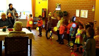 Die Kinder der Hummelgruppe besuchten die Geburtstagskinder im DRK-Pflegeheim in Königswartha, welche im Oktober und November ihren Geburtstag feiern durften. Aufregend war schon der Weg, denn die Mädchen und Jungen trugen ihre selbst gestalteten Laternen mit ebenso leuchtenden Augen. Mit fröhlichen Liedern gratulierten die Kinder den Jubilaren und überreichten ein kleines Geschenk. Darüber freuten sich die Seniorinnen und Senioren ganz besonders.