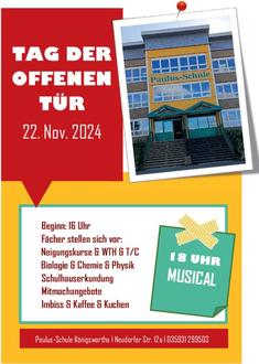 am 22. November sind sie zu einem Tag der offenen Tür in der Paulus-Schule eingeladen. Wir möchten Ihnen ab 16 Uhr unsere Schule vorstellen. Sie erhalten Einblick in unser pädagogisches Konzept, zum Aufnahmeverfahren und sind eingeladen mit Lehrerinnen und Lehrern ins Gespräch zu kommen. Unsere Schülerinnen und Schüler zeigen Unterrichtsergebnisse und stellen die Fächer der Oberschule vor.