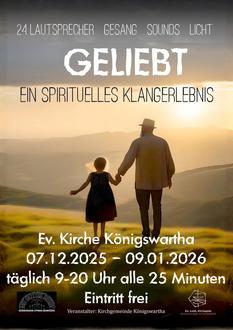 In der Advents- und Weihnachtszeit ist wieder eine Klanginstallation in unserer Kirche zu erleben. Täglich von 9:00 bis 20:00 Uhr steht die weihnachtlich geschmückte Kirche für Sie offen. Alle 25 Minuten startet die Klanginstallation GELIEBT von Neuem. Hören, sehen und erleben Sie, dass die Botschaft der Liebe Gottes auch Ihnen gilt! Pfr. Mahling