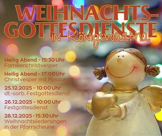 | 25.12. | 10:00 Uhr | Dt. Sorb. Festgottesdienst mit Hl. Abendmahl, Posaunenchor und Kindergottesdienst | |