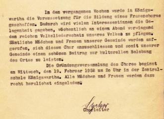 „In den vergangenen Wochen wurde in Königswartha die Voraussetzung für die Bildung eines Frauenchores geschaffen. Dadurch wird vielen Interessentinnen die Gelegenheit gegeben, wöchentlich an einem Abend vorwiegend den reichen Volksliederschatz unseres Volkes zu pflegen. Sämtliche Mädchen und Frauen unserer Gemeinde werden aufgerufen, sich diesem Chor anzuschließen und somit unserer Gemeinde einen schönen Beitrag zur kulturellen Belebung des Ortes zu leisten. Die Gründungversammlung des Chores beginnt am Mittwoch, den 19. Februar 1958 um 20 Uhr in der Zentralschule Königswartha. Alle Mädchen und Frauen werden dazu recht herzlich eingeladen.