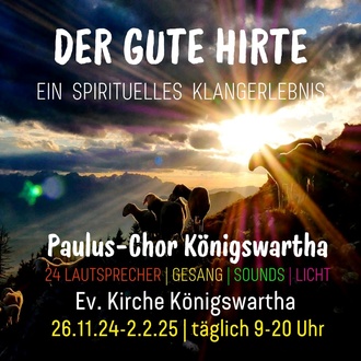 Über den Jahreswechsel ist die Klanginstallation "Der gute Hirte" wieder in Königswartha zu erleben. Täglich von 9-20 Uhr wird unsere Kirche zum Klangraum, der die Botschaft von Psalm 23 hörbar, spürbar und erlebbar macht. Während dieser Zeit steht die Kirche offen. Die Klanginstallation läuft 15 Minuten und beginnt alle 20 Minuten von vorn. Vom Totensonntag bis zum 2. Februar laden wir Sie herzlich zur spirituellen Klanginstallation in die Kirche Königswartha ein!