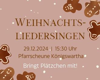 Am Sonntag, dem 29. Dezember laden wir herzlich zum Weihnachtsliedersingen in die Pfarrscheune Königswartha ein. Es wird Kinderpunsch und Kaffee geben. Ich freue mich, wenn jeder etwas aus seinem Plätzchenfundus beisteuert und dann wollen wir gemeinsam die vertrauten Weihnachtlieder singen: O du fröhliche, Kommet ihr Hirten, Ich steh an deiner Krippen hier und was uns noch so in den Sinn kommt. Wer möchte, kann auch sein Instrument mitbringen und so unser Miteinander bereichern. Beginn ist 15:30 Uhr und natürlich ist in der Pfarrscheune geheizt!