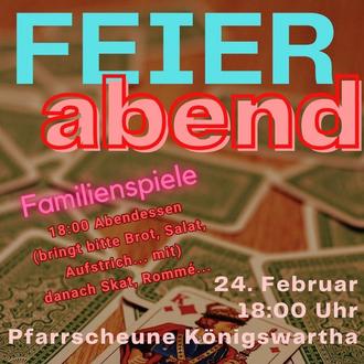 | 24.02. | 18:00 Uhr | FEIERabend mit Familienspielen in der Pfarrscheune |