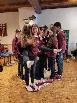 Unser Tag startete mit dem Schulgottesdienst. Im Anschluss haben wir mit der ganzen Klasse das gemeinsame Frühstück in der Pfarrscheune vorbereitet und natürlich zusammen gegessen. Das Ziel unseres Klassentages außerhalb der Schule war es, als Klasse noch besser zusammenzuwachsen und den Klassenzusammenhalt zu stärken. Mit Teppichstücken spielten wir ein Spiel, bei dem wir miteinander reden, aufeinander achten und uns alle einbringen mussten. Das fiel uns zunächst schwer, aber dafür absolvierten wir den zweiten Durchlauf schon viel besser. In der Auswertung fanden wir auch Zeit über unsere Probleme innerhalb der Klasse und was wir verbessern wollen, zu reden. Die offene und vertrauensvolle Atmosphäre tat uns allen gut. Als Vergleich für unsere Klassegemeinschaft nahmen wir Wasserperlen, die am Anfang winzig klein waren und mit Zugabe von Wasser stetig wuchsen. Den Tagesabschluss bildete das Mittagessen. Für die Zubereitung von Salat, Kartoffelsuppe, Quarkspeise und Kinderpunsch erfolgte in Gruppen und anschließend ließen wir`s uns schmecken.