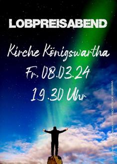 Am 8. März freuen wir uns wieder über Bandmusik in der Kirche Königswartha. Norbert Binder & Band spielen ab 19:30 Uhr moderne geistliche Lieder und laden zum Mitsingen ein. Außerdem gibt es die Möglichkeit, für sich beten und sich segnen zu lassen.