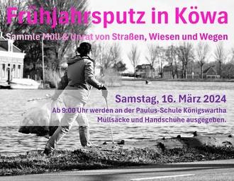 Am Samstag dem 16. März laden wir ein zum Frühjahrsputz in und um Königswartha. Ab 9:00 Uhr werden an der Paulus-Schule Müllsäcke und Handschuhe ausgegeben, in die dann auf den Wegen und Plätzen in und um Königswartha herumliegender Unrat gesammelt werden kann. Bis 12:00 Uhr können die vollen Müllsäcke wieder an der Paulus-Schule abgegeben werden.