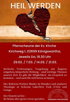 Im März lädt der Förderverein der Kirchgemeinde Königswartha zu einer besonderen Vortragsreihe zum Thema Heil und Heilung ein. Referent ist Norbert Binder. Er fragt danach, wie der Glaube Wege zu seelischer Gesundheit weisen kann.