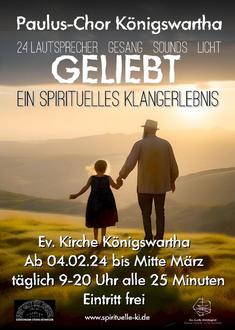 Bis mindestens Mitte März ist auch noch die neue Klanginstallation GELIEBT in der Kirche Königswartha zu erleben. Besonders in der Abendstunden beeindruckt die Lichtinstallation. Sie sind herzlich eingeladen, in der offenen Kirche zu verweilen und den Klängen der Musik zu lauschen.