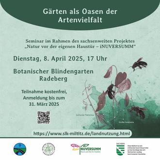 Das kostenfreie Seminar „Gärten als Oase der Artenvielfalt“ im Rahmen der Mitmachinitiative „Natur vor der eigenen Haustür – iNUVERSUMM“ findet am 8. April 2025 ab 17 Uhr in Radeberg statt.